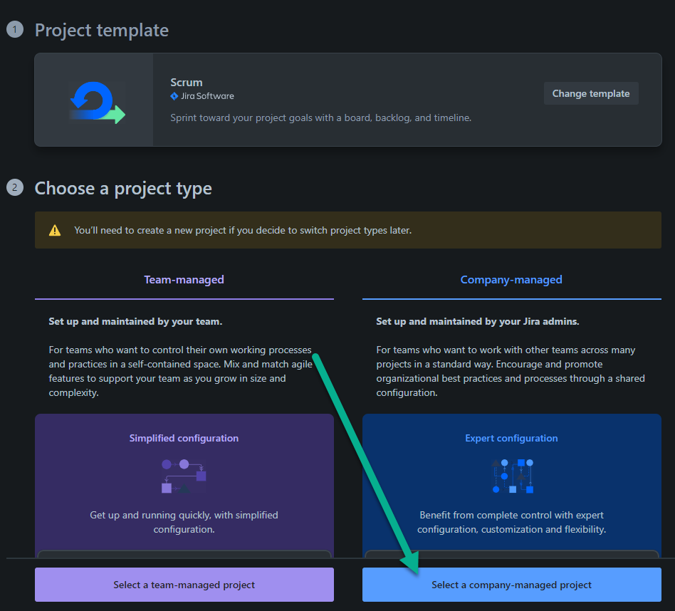 next you need to select a project type. For RTM to work properly you must use a company managed project. Click on Select a company-managed project