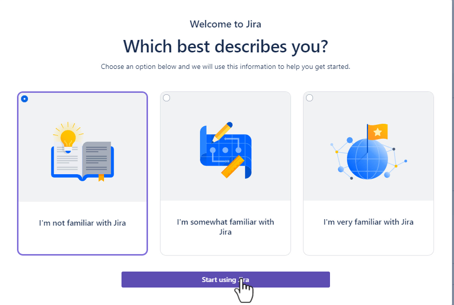 In a few moments you project will be created and you will see a page that asks about your experience with jira. Choose I'm not familiar with Jira and click Start Using Jira.