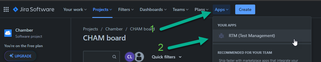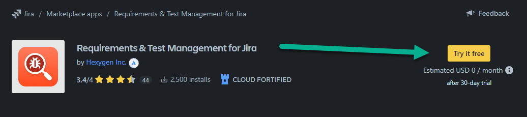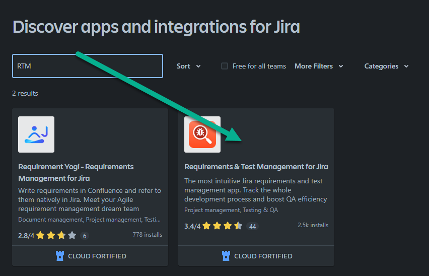 In the search box, type RTM and press ENTER. This will display the Requirements & Test Management for Jira app.