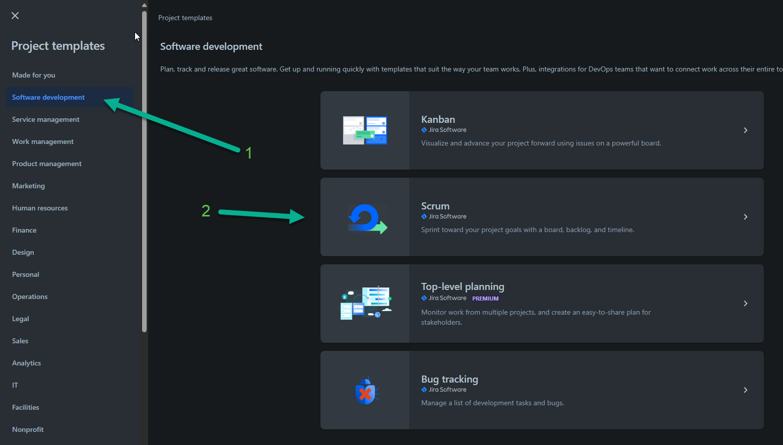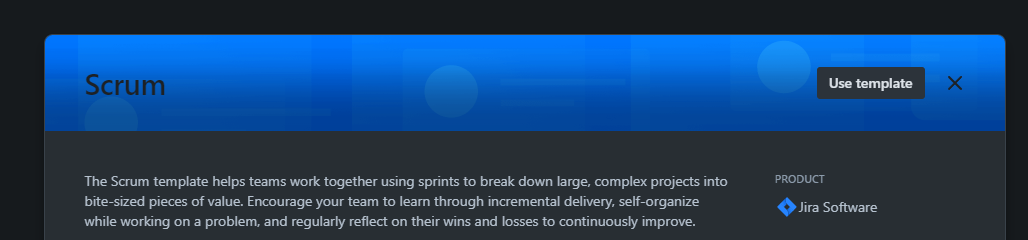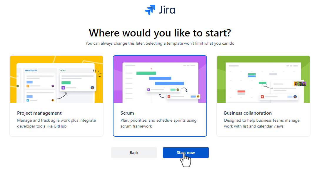 Once the software is complete you must choose the template. Choose SCRUM and click the Start Now button.