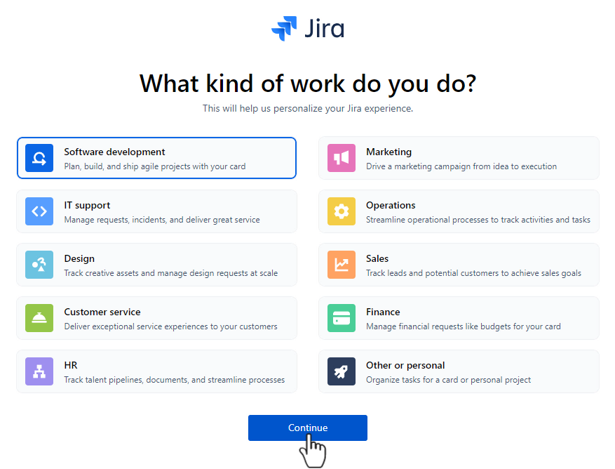 Next you will will be asked what kind of work you do. Select Software Development then click the Continue button.