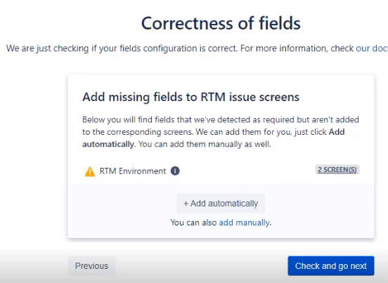On the "Correctness of fields" screen, in the "Add missing fields to RTM issues screens", click + Add automatically. Then click Check and go next.
