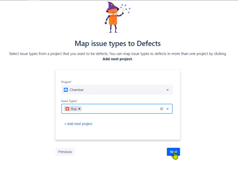 On the "Map issue types to Defects" screen, select Bug in the Issue Types box. Then click Next.