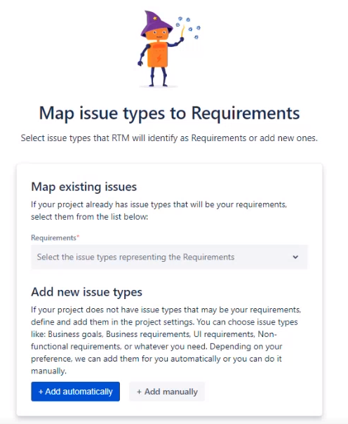 On the "Map issue types to requirements" screen click + Add automatically. You should see the following screen. Click Next