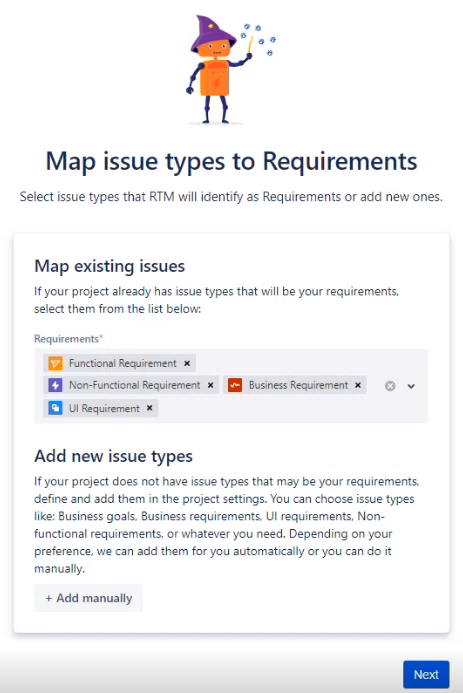 Map issue types to Requirements. You should see the following screen, notice the issue types. Click Next