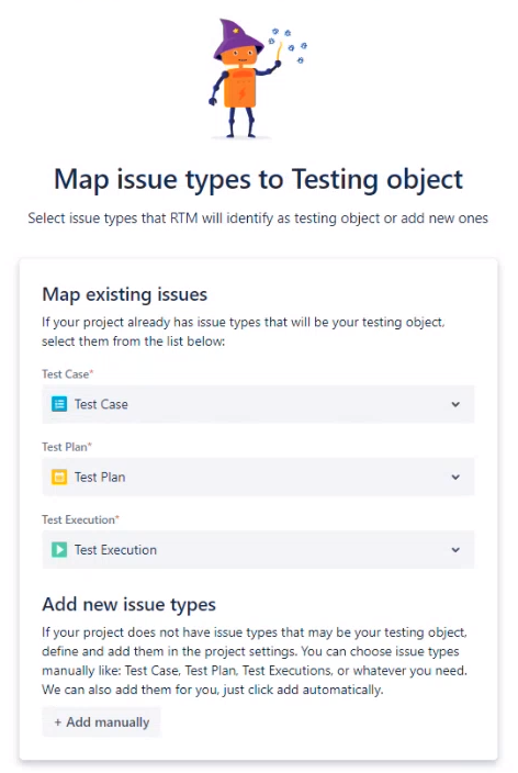 On the "Map issue types to Testing object" screen click + Add automatically, then click Next.