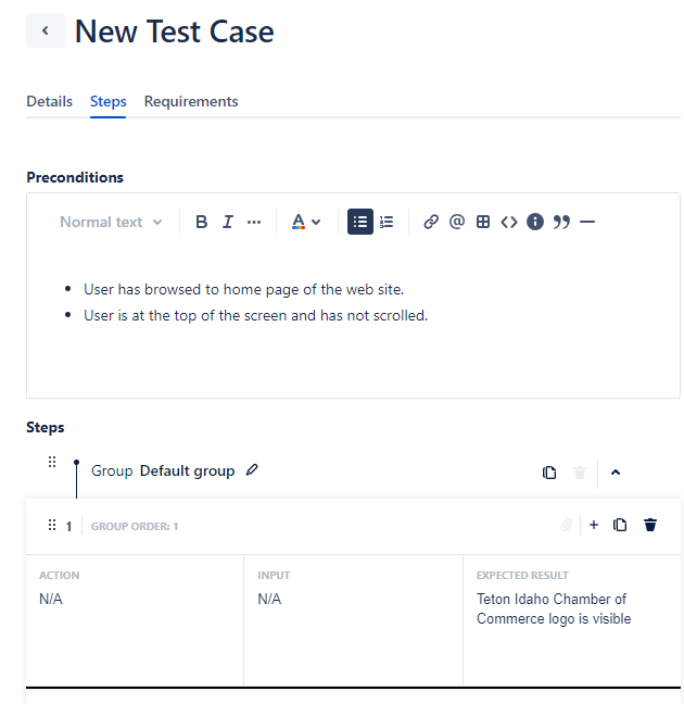 - In the Preconditions box, add any preconditions that are necessary for the test. Example: "Browse to Chamber website."
