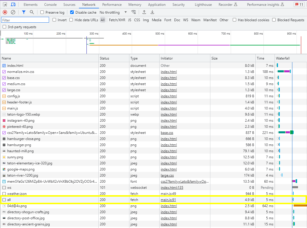 Chrome Dev ToolsFrom this toolbox we can get information about the HTTP calls the browser is making in response to information in the web page. To do this, click on the Network tab, then press Ctrl-R or Command-R to reload the page. This will show you all of the web calls made by the page to gather information, including our call to the Directory Data Service represented by the "all" URL.