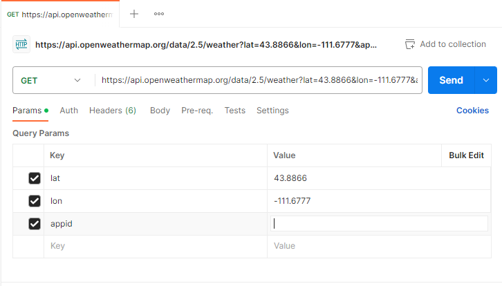 The API for current weather also requires a few query params. We will add the lat, lon, and appid to the query params section in Postman as shown.