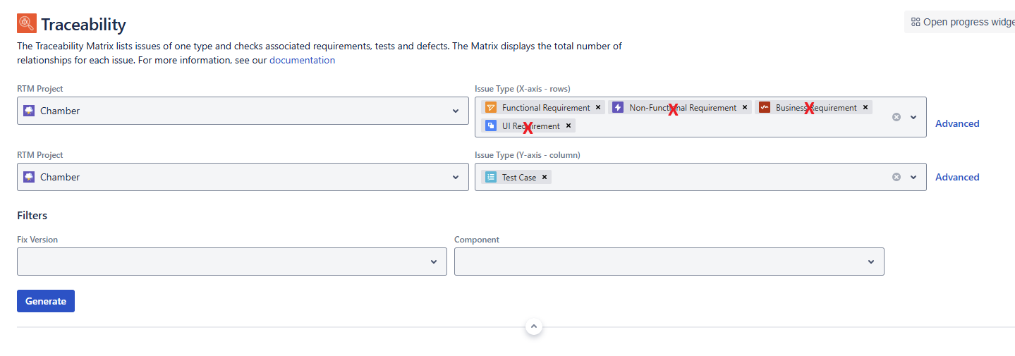 In order to create the traceability report, you must choose Test Case for the Issue Type (Rows) section.
