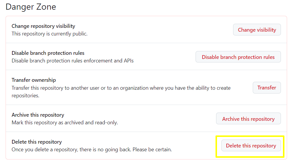 Delete Repository - Click the Delete this repository button and follow the prompts to delete your repository.