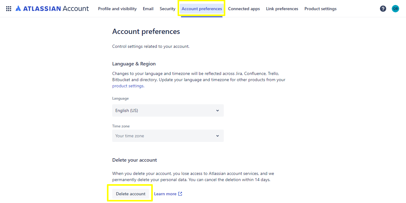 From the ATLASSIAN account page, choose Account Preferences.