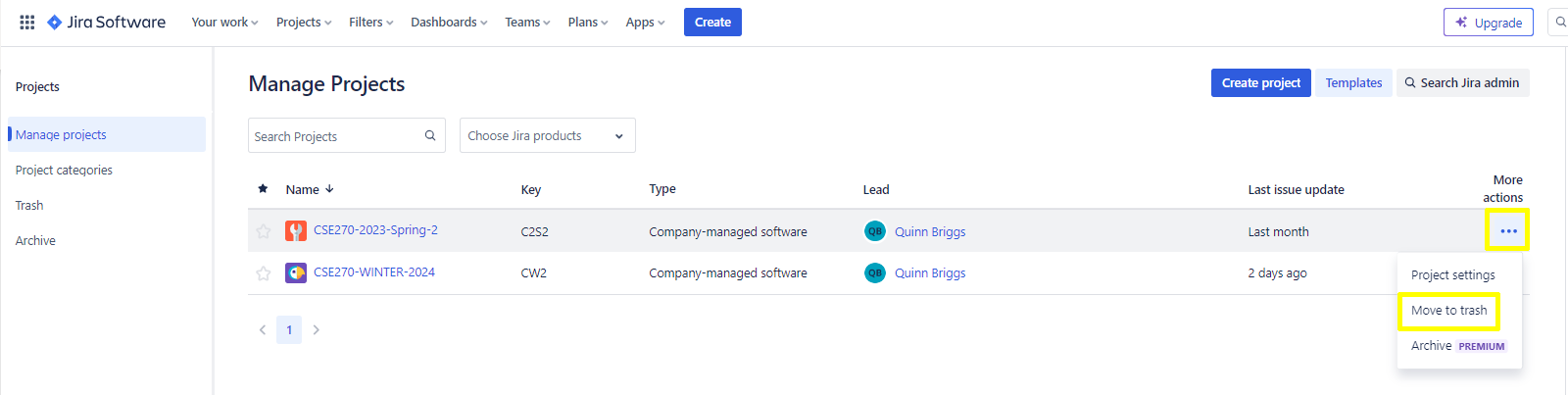Since you will no longer need your Jira project used for this course you will delete it.