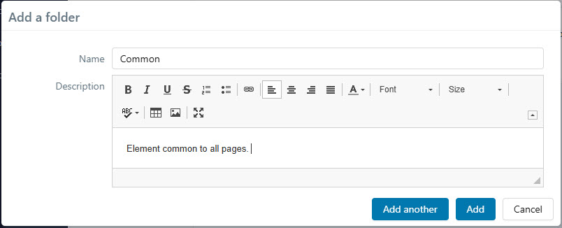 Add a folder - Enter the folder name in the Name box, you may also add a description. For example for our first functional requirement area you would enter Common in the name box, and in the description box enter something like "Elements common to all pages". Then click the Add button.